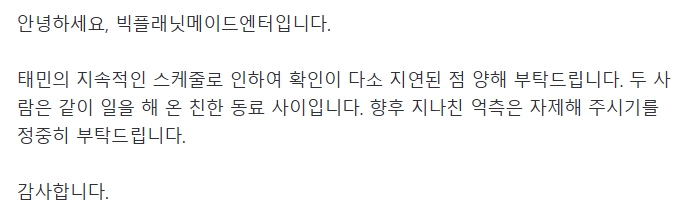 태민 소속사 빅플래닛메이드 측은 현재 “확인 중”이라는 입장만 전했으며,